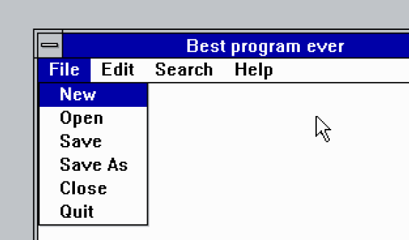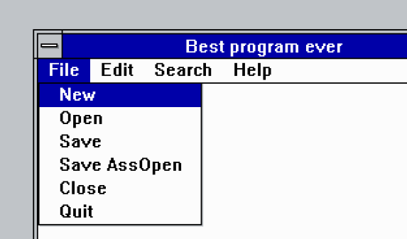 MENUITEM(mnu_file, mnu_saveass, s_menu + 14);He put them in separate lines to make it easier to read, but C combines them into a single one, like "File\0New\0Save\0".... This counting was cumbersome, but it worked. His big presentation was already the next day and he was burning the midnight oil to get everything working. In a very tired state he finished the project and got it to build. He copied everything to a floppy disk and finally earned himself three hours of well deserved sleep.
