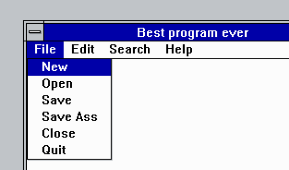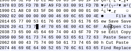 What happened? He had forgotten the null-terminator. You can see it in the code above. One small typo, big effect. The developer started panicking. The presentation would be in 10 minutes! He couldn't show this to his bosses, potential clients and investors. But there was no C compiler on the presentation computer. His mind was racing: "Maybe I can quickly run up to my office? That would take 5 minutes. Boot the computer, hand-count all the new indices , recompile, copy ... 5 more minutes. Run back ... No there's simply no time for that!". The presentation could not be delayed either. So MacGyver-style, he looked around the PC, if there were any tools lying around, which he could somehow use to quickly fix this. And he got lucky. He found a HEX-Editor which would allow him to alter the compiled program directly. But with this tool you can't insert new characters, you can only edit existing ones. He had to make the menu item one character shorter to fit in the missing \0. He briefly thought about removing the space, and converting it so SaveAss\0, but that looked ugly. In the end, he chose so sacrifice the second "s" in "Ass" instead, as this also made sense.